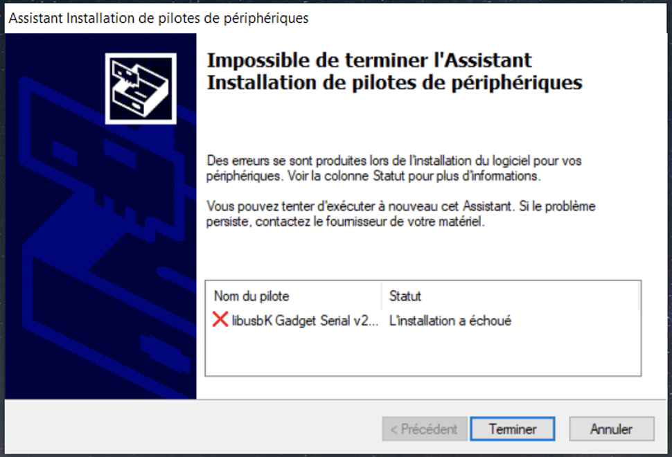 - Si la fenêtre indique « L’installation à échoué » Pas de panique ! Vous pouvez cliquer sur « Terminer », nous allons voir comment mettre à jour votre matériel dans la rubrique suivante.