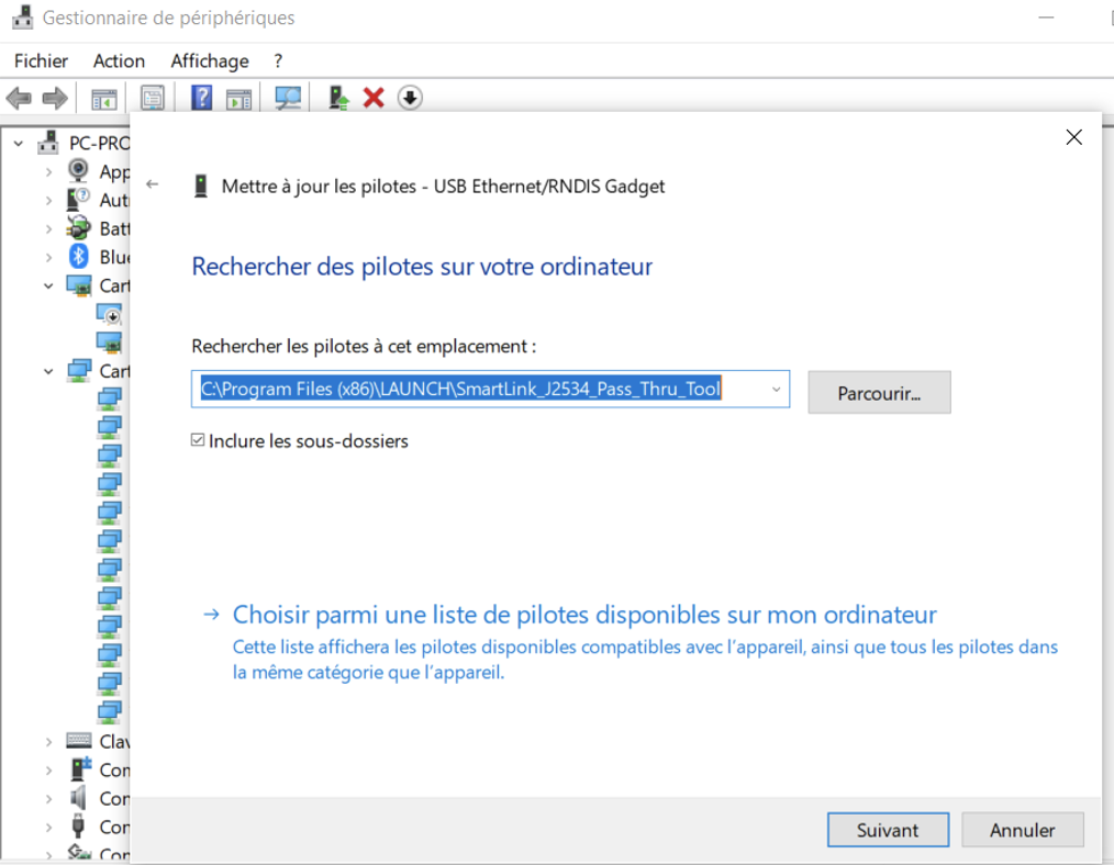 C’est là que se situe le « Bon Driver » et « Mis à Jour » par LAUNCH. Vous pouvez donc cliquer sur « suivant ». Votre périphérique sera ainsi considéré comme périphérique nommé USB Ethernet/RNDIS Gadget dans la rubrique Carte Réseau de votre PC.