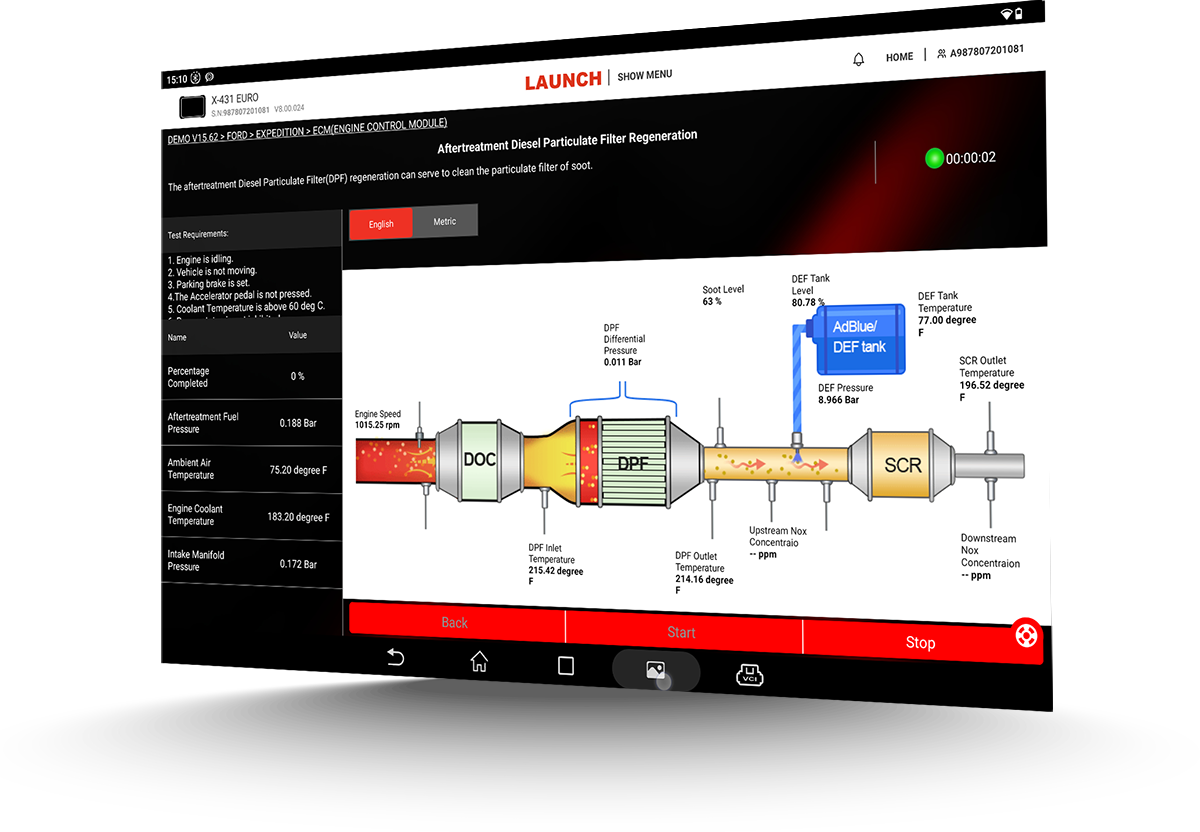 Le X-431 EURO propose une régénération du FAP assistée visuellement, permettant d’afficher l’ensemble du processus de manière claire et compréhensible. Toutes les données essentielles sont visibles en temps réel, garantissant un suivi précis de l’avancement.