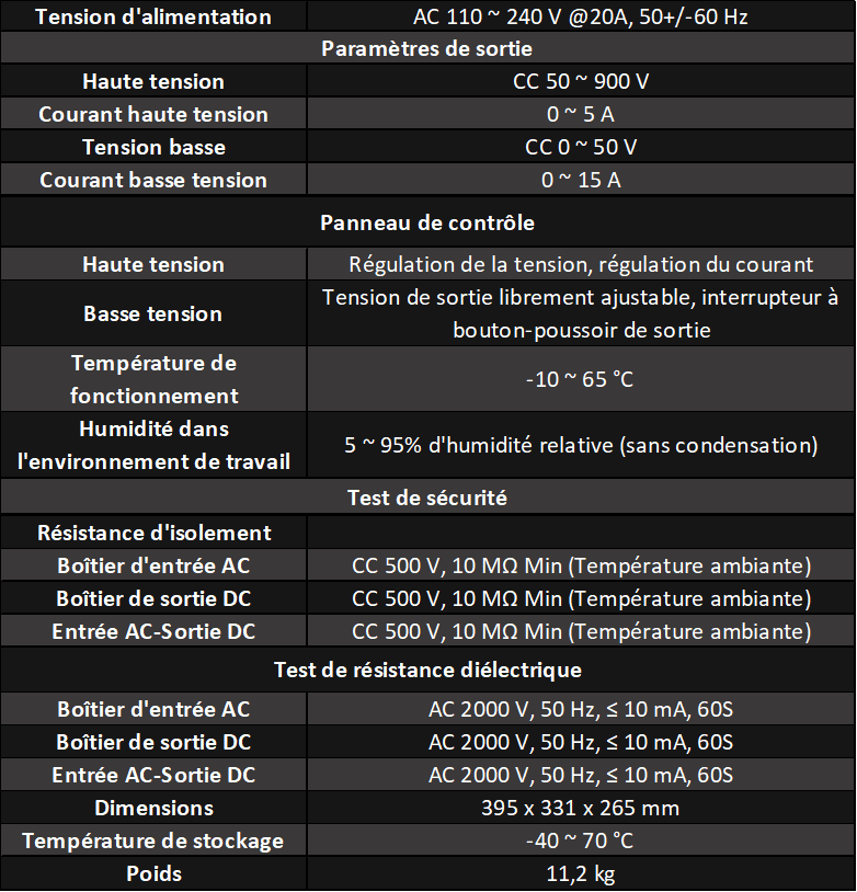 Pour le circuit d'entrée, le circuit de sortie haute tension et le circuit de sortie basse tension. Le système détecte les défauts tels que la sous-tension, la surtension, la surintensité, le court-circuit et déclenche les mesures de protection appropriées. De plus, une alarme sonore est déclenchée en cas de défaut.