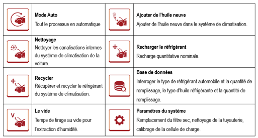 En fonction des paramètres prédéfinis, le nettoyage, la récupération, le vide, le remplissage d'huile, de réfrigérant et d'autres opérations sont effectués automatiquement