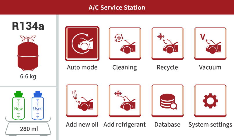 La station de climatisation AC519 est un équipement de maintenance automobile entièrement automatique et intelligent, intégrant des fonctions telles que le nettoyage sans démontage, la récupération du réfrigérant, le remplissage et le tirage au vide.Elle améliore efficacement les problèmes liés à une mauvaise performance de refroidissement de la climatisation, une charge élevée du compresseur, un bruit important et une consommation excessive de carburant.
